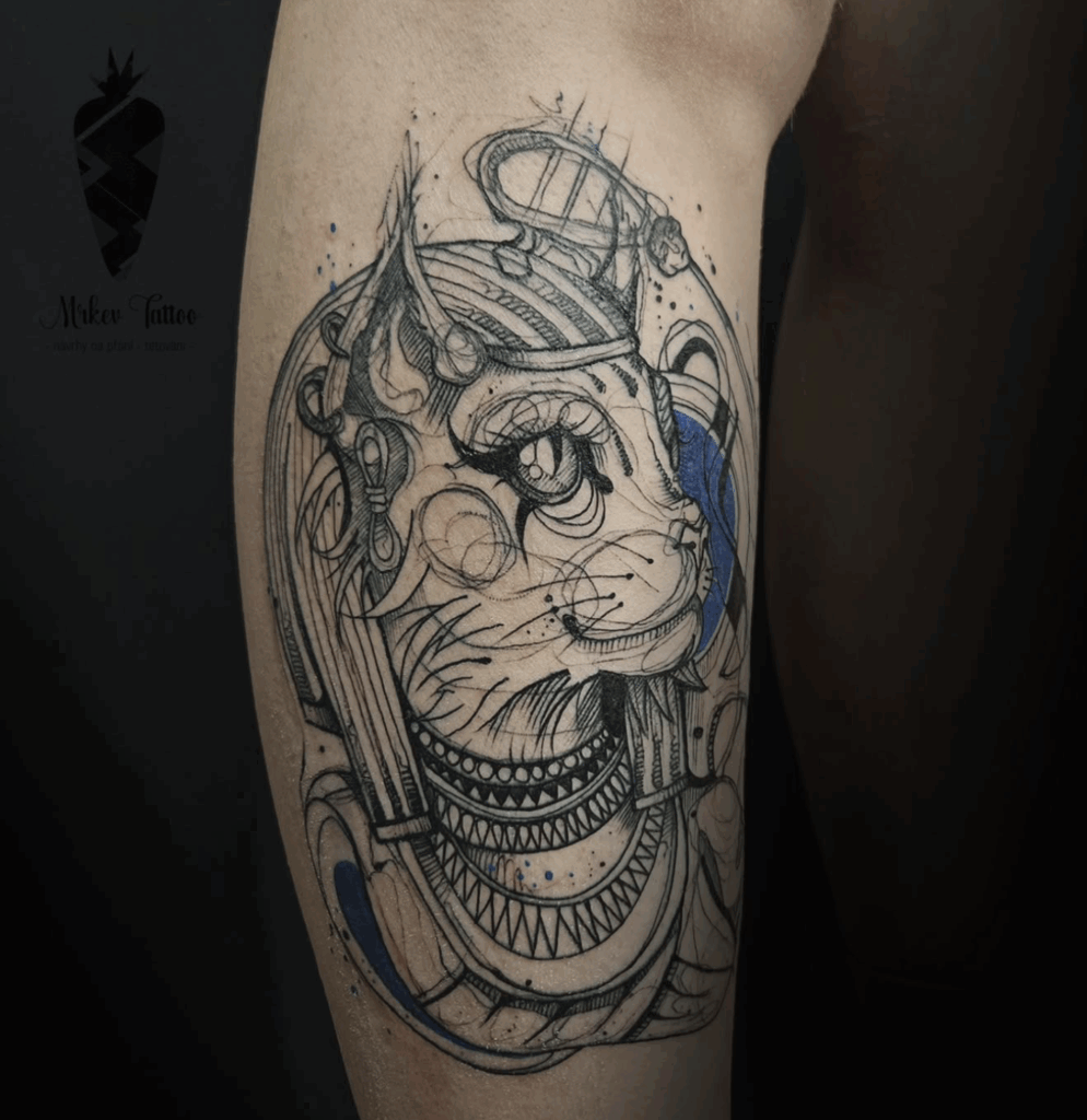 A co bych netetovala? Realistiku. Kromě těch běžných zakázaných věcí, tak cokoliv realistickýho. Říkám si, že od toho máme foťáky a fotky na památku. Je to každého věc, jen ji nesmí čekat odemě. A ještě nějak polknu přírodu, auto, zvíře, skupiny lidí – třeba motivy z Obrazů…ale ne soukromý portréty. Já prostě nějak nemůžu překousnout portréty maminky, tatínka, dětí. Mám pocit, že už se to tak moc ani neděje, ale byla doba, kdy to fakt bylo na každým rohu. A ideálně k tomu datum narození? Tak to je učiněný vrchol fantazie, to se vždycky skláním před tímto jedinečným nápadem, vyobrazit realistickou Marušku Pospíšilů s datem narození. Už chybí jen podpis primáře FN Brno a hotovo, uhořim blahem. Jo a Maruška bude mít modrý oči! 😀 Co se motivu týče, pokud mám volnou ruku, tak vykéruju cokoliv. Spíš mám ještě takovou libůstku v tom, že nepotetuju obličej. Jsem tatérka, ale určitý zásady se ctít musí. A obličej je pro mě svatej. Nepočítám prostor kolem ucha (pejzy), ucho, ve vlasové časti, pod bradou atd. Ale tu pohledovou část, kolem očí, nad obočí, kolem nosu a papule, tam prostě ne.