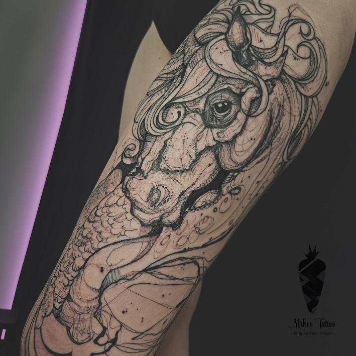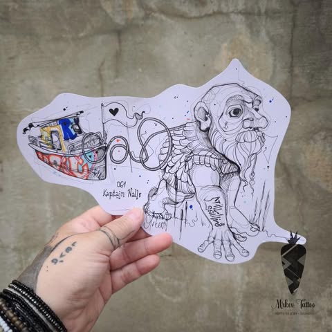Symbolika a význam? Takhle, když vezmu v potaz, že si někdo nechá vykérovat moje motivy, třeba ilustraci česneku, ukazující prstíčkama V, jakože někoho zdraví. A u toho nápis „ČUSnek“. Tak moc nemůžu zastávat hluboký významy. Koukám se na to takhle – Pokud to pro někoho má význam a hloubku, jsem ráda, vážím si toho, že si lidi daj tu práci a zamyslí se nad tím, proč zrovna tohle. Často se t oděje u motivů na zakázku. Stejně tak si ale vážím i lidí, kteří si vyberou moje volný motivy, jen proto, protože se jim to líbí. A fakt nejradši mám ty, který jsou trochu sarkastický, trochu humorný a je jedno, jestli jsou zrovna na zakázku – třeba žralok kladivoun, kde mě spontánně napadlo udělat okolo hřebíky, jemu k hlavě otazník a zákaznice souhlasila. Nebo z výstavky volných návrhů – třeba ČUSnek. Takže ano, jsem za, aby kérky měly význam, když ho ale nemaj nebo není hlubokej, tak mi to nevadí. Někdy stačí prostě jen „mít důvod“. To, že umře dědeček není význam kérky, to je důvod, proč si vykérovat, třeba i vtipnou vzpomínku na dědečka. Ty významy a příběhy se mnohdy berou až moc vážně a to je blbý, páč by se lidi neměli tak vážně vnímat. Nikdo je tak nevnímá, tak by to neměli hrotit ani lidi sami.